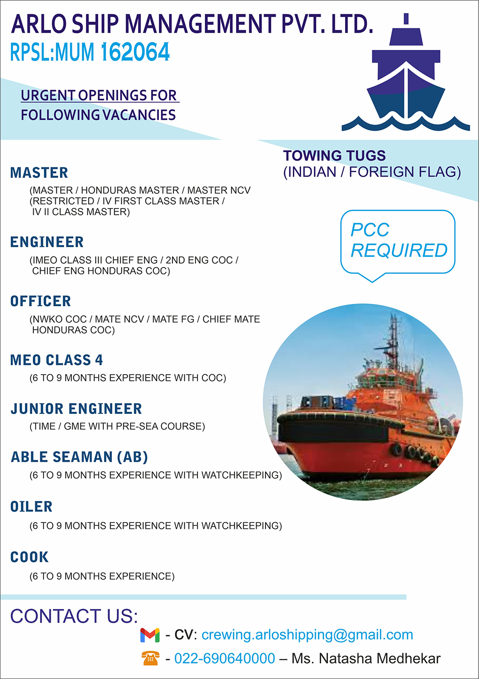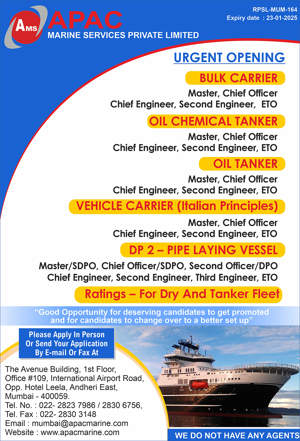 | APAC MARINE SERVICES PVT LTD., | RPSL-MUM-164 | 23/01/2025 | Jobs & Contact Details |